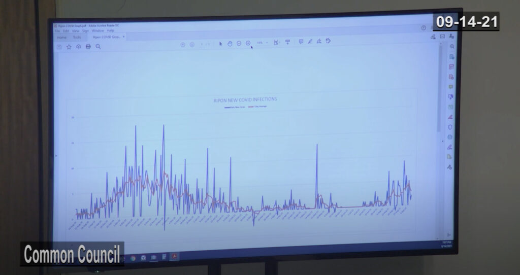 “The graph that was used in the September 14th meeting and was used to support the approval of this policy, why was that not included in the September 14th agenda packet and why not supplied in the September 14th minutes published? Where did the graph come from? Where can I find it? What test is used to determine the new covid cases in Ripon?”