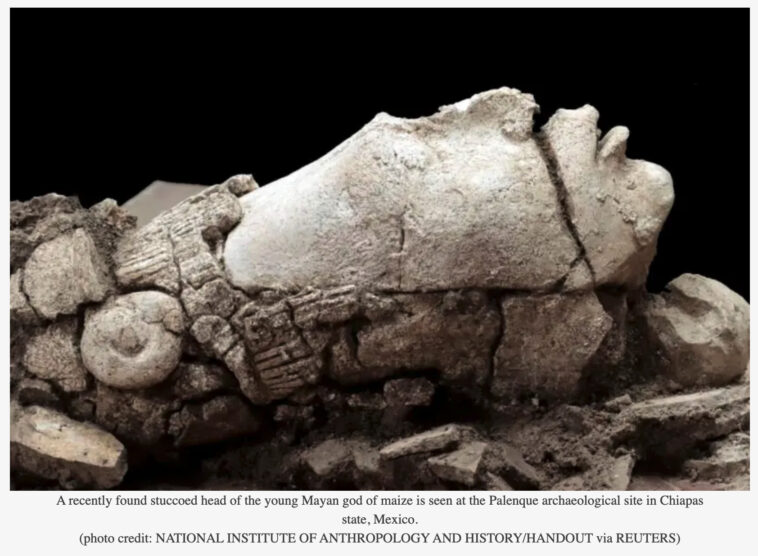 A recently found stuccoed head of the young Mayan god of maize is seen at the Palenque archaeological site in Chiapas state, Mexico.